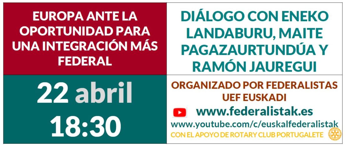 Este acto, está organizado por Federalistas UEF Euskadi y auspiciado por el Rotary Club de Portugalete, tendrá lugar mediante conexión telemática al canal de Youtube, el próximo jueves, día 22 de abril, a partir de las 18,30 horas, en el enlace que se indica a continuación: www.youtube.com/c/euskalfederalistak