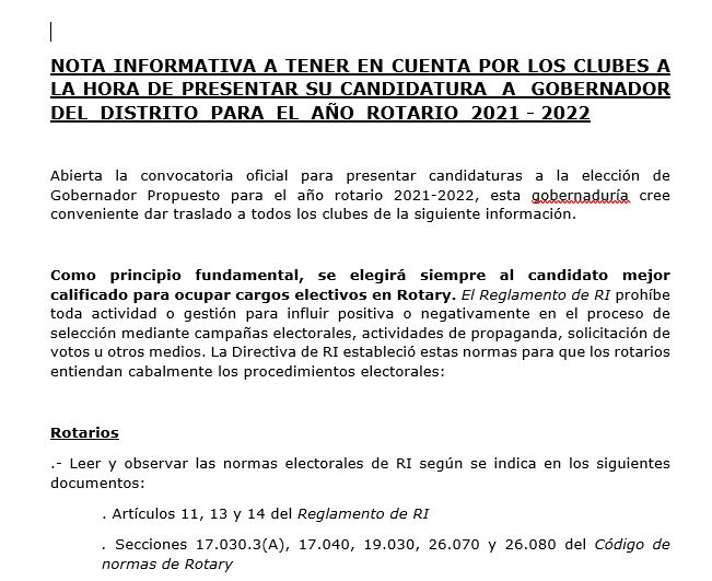 NOTA INFORMATIVA A TENER EN CUENTA POR LOS CLUBES A LA HORA DE PRESENTAR SU CANDIDATURA A GOBERNADOR DEL DISTRITO PARA EL AÑO ROTARIO 2021 - 2022